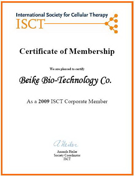 2009年8月,北科生物獲得國際細胞治療協(xié)會(International Society for Cellular Therapy,ISCT)會員資格,并獲得了該協(xié)會頒發(fā)的會員證書,成為該機構(gòu)的正式會員。