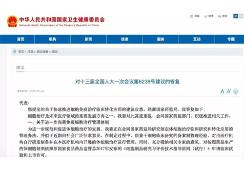 您提出的關(guān)于快速推進(jìn)細(xì)胞免疫治療臨床轉(zhuǎn)化應(yīng)用的建議收悉。經(jīng)商國家藥監(jiān)局,現(xiàn)答復(fù)如下: