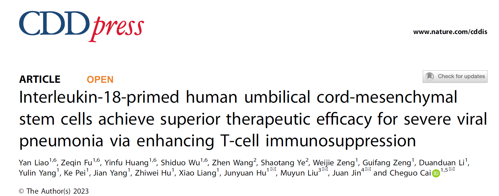 2023年1月28日,深圳市北科生物科技有限公司研發(fā)中心蔡車國教授和廖延博士團隊在國際權威學術期刊《Cell Death & Disease》(影響因子=9.68,中科院一區(qū))在線發(fā)表關于炎癥因子IL-18賦能型臍帶間充質干細胞可增強針對重癥病毒性肺炎導致肺損傷治療效果的研究成果。論文題為:“Interleukin-18-primed human umbilical cord-mesenchymal stem cells achieve superior therapeutic efficacy for severe viral pneumonia via enhancing T-cell immunosuppression”。近年來。北科生物科研成果轉化穩(wěn)步提升,不僅體現(xiàn)在“量的增長”上,更體現(xiàn)在“質的飛躍”上。北科生物在高水平論文,尤其是國際權威期刊的學術論文發(fā)表方面不斷取得突破, 正是其科研實力和技術創(chuàng)新方面的實力體現(xiàn)。