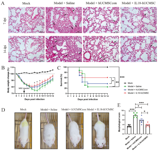在本研究中,研究人員發(fā)現(xiàn)通過使用炎癥因子IL-18在體外培養(yǎng)階段“賦能”臍帶MSCs,可以在體外實驗中有效增強對T細胞的免疫調節(jié)作用;在體內實驗中緩解病毒引起的肺部重癥炎癥,從而減少肺部損傷、提高病毒性肺炎模型小鼠的生存率,且改善多種臨床表現(xiàn)(圖2)。